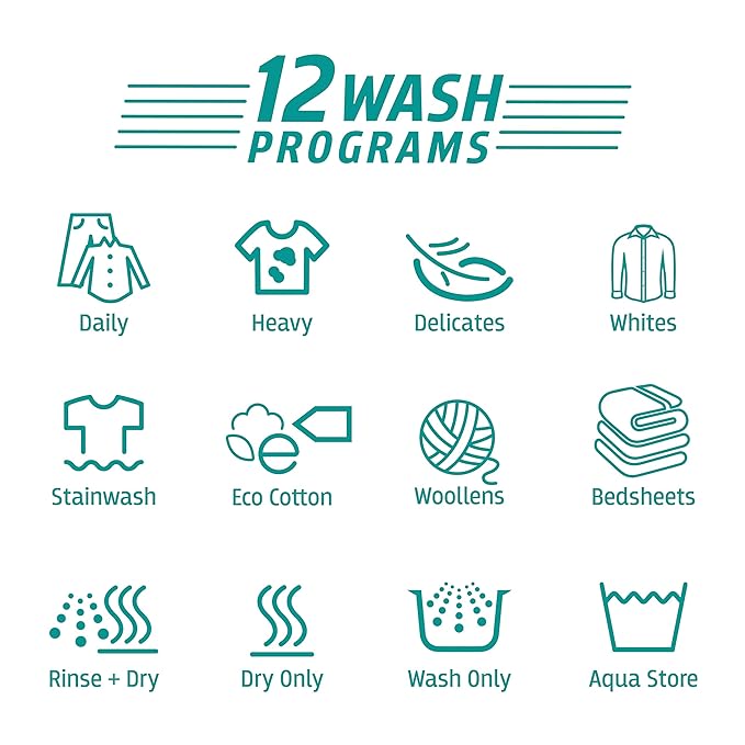 - 12 Wash Programs – Daily, Heavy, Delicates, Whites, Hard Water Wash, Eco Wash, Woollens, Bed Sheet, Rinse +Spin, Spin, Wash Only, Aqua Store